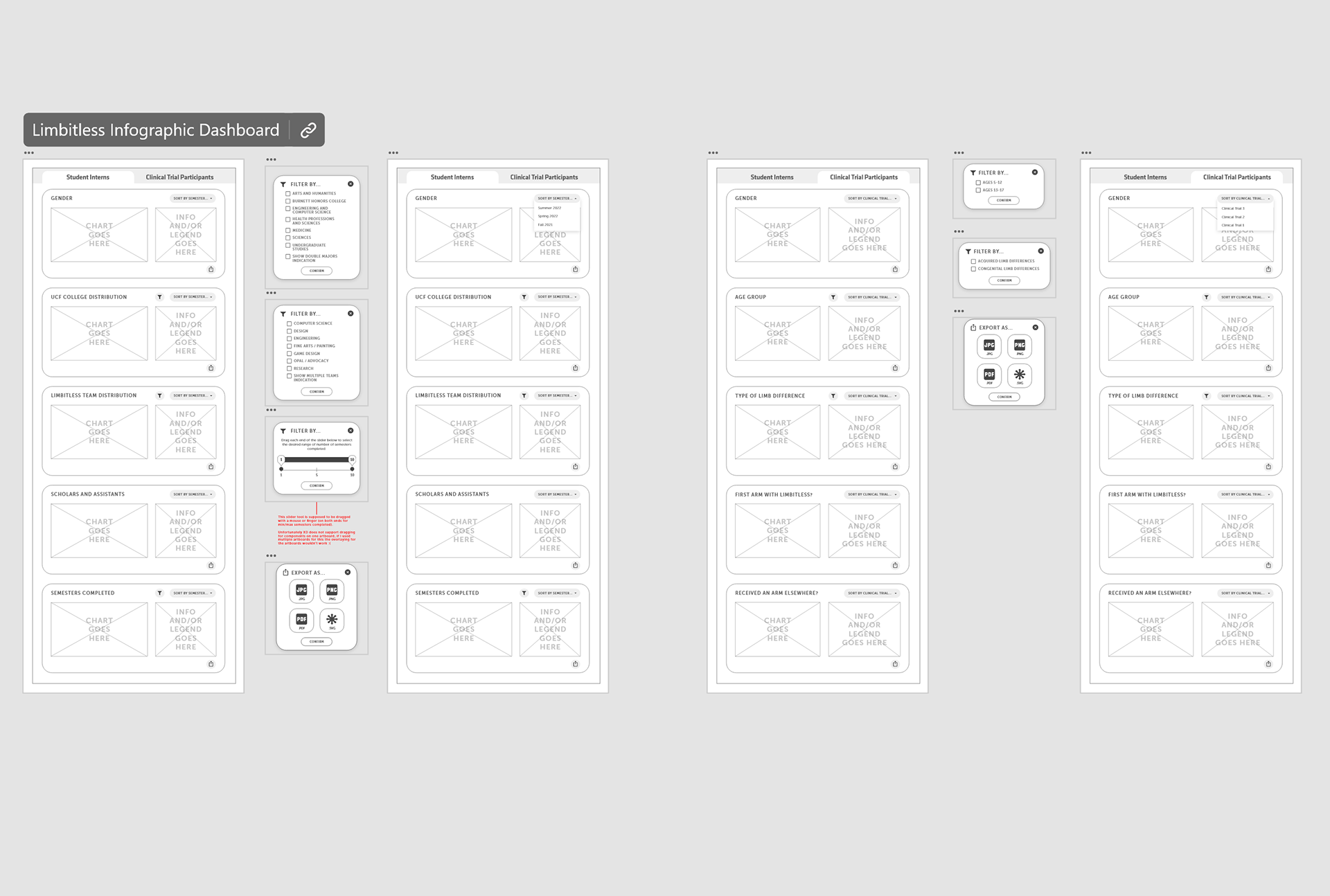 The new infographic dashboard is designed to dynamically pull data directly from Limbitless' internal database, updating charts with new data when necessary. Each dataset on the dashboard is also centralized to easily streamline data as well as providing a variety of filtering options and export options. This eliminates the need for interns to create new infographics from scratch, as well as providing a centralized and accessible place for data.