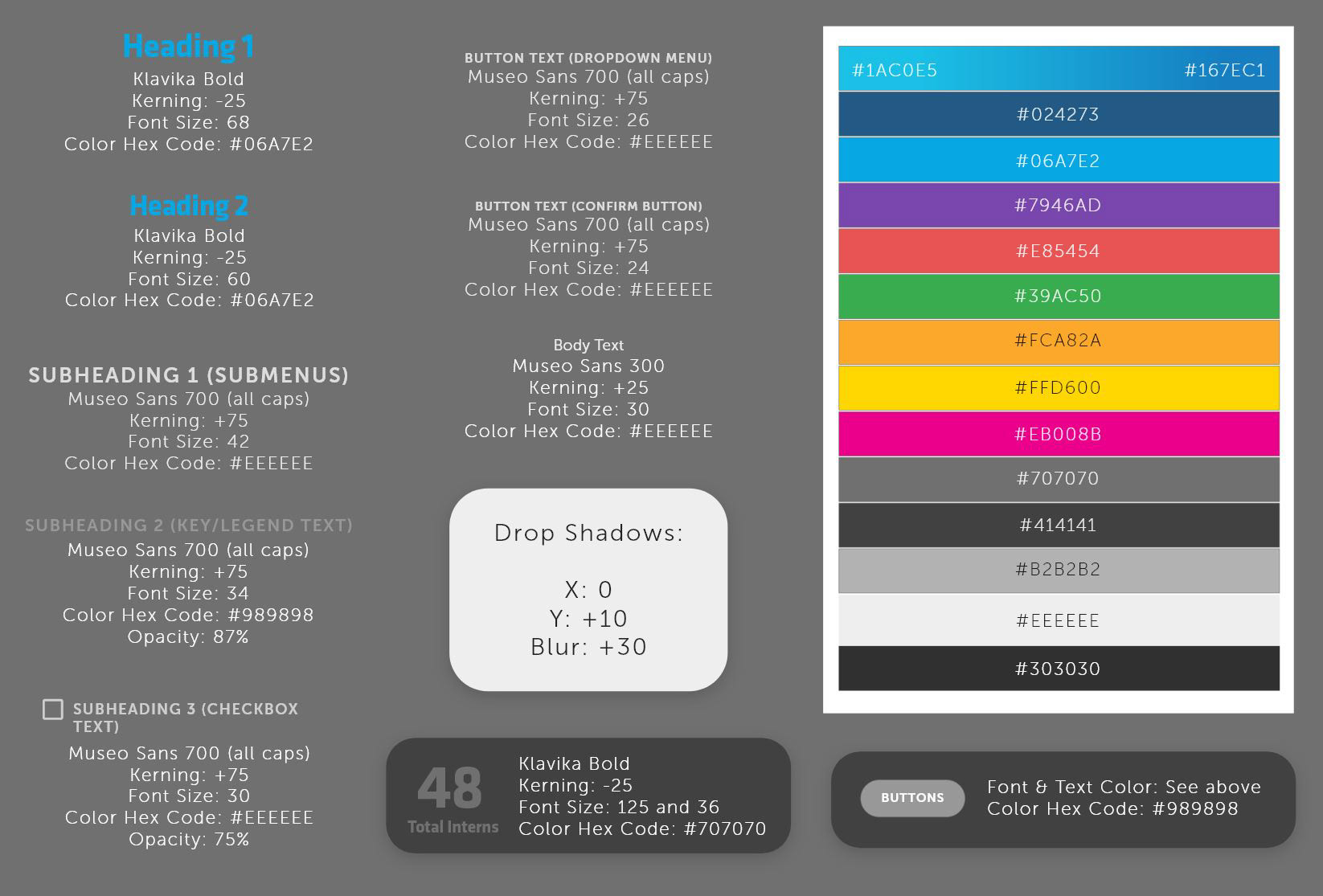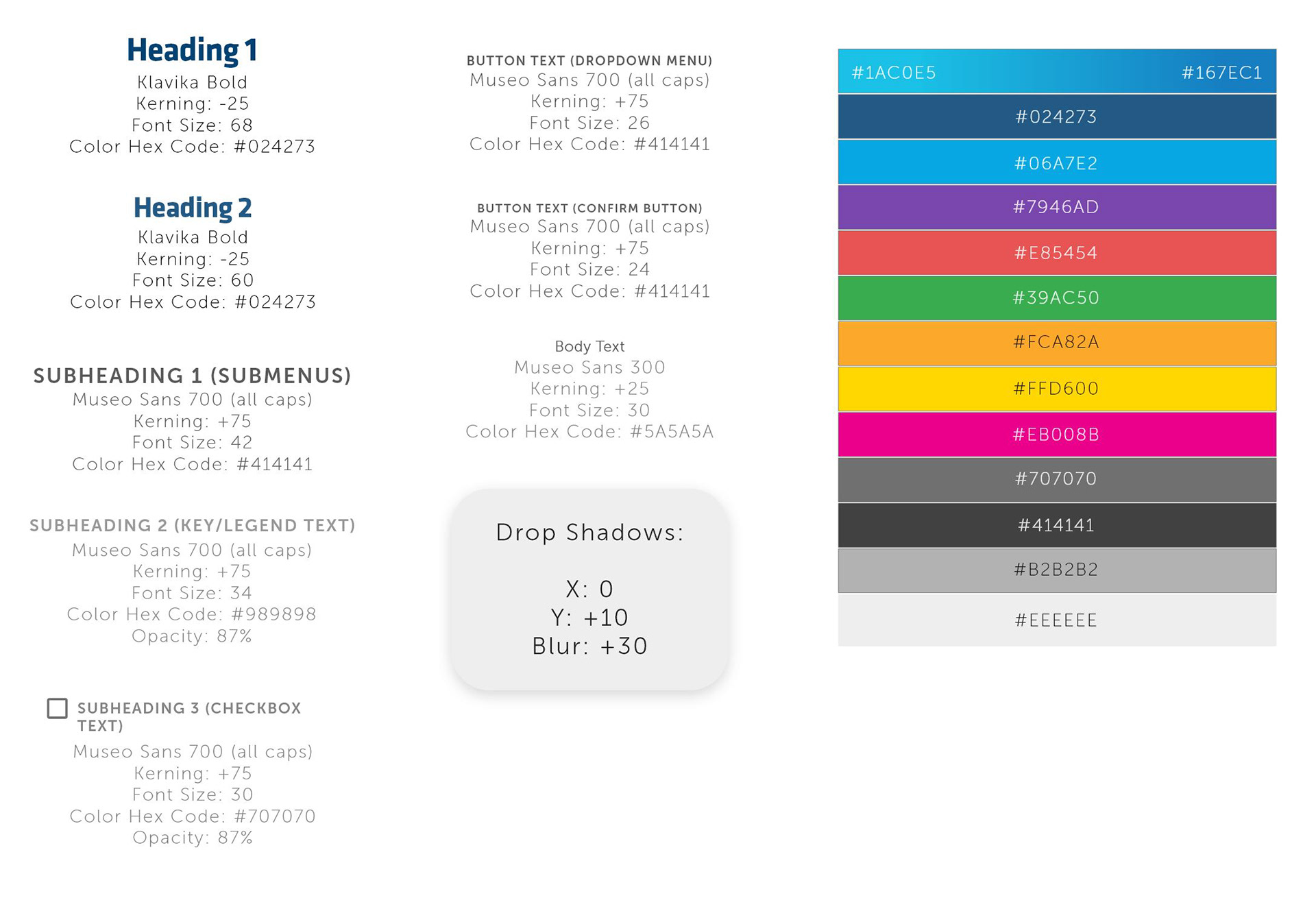 The dashboard's design system followed along with Limbitless' branding and Material Design guidelines, to keep it consistent with the rest of the internal website. Blues, whites, and grays were primarily used throughout the dashboard to fit the innovative spirit of Limbitless, while other colors were mainly used for to differentiate data being displayed in each infographic.